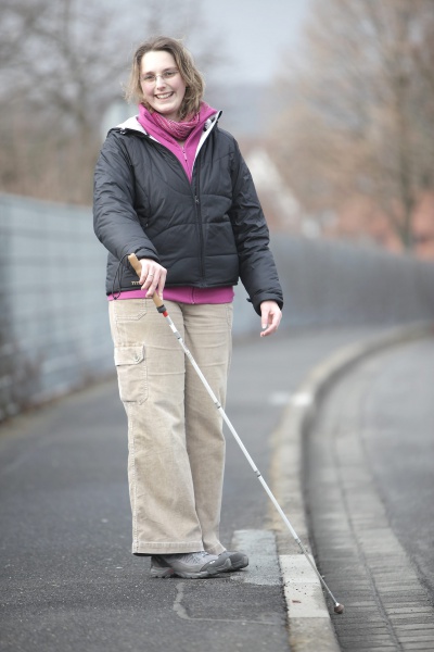 Junge Frau mit einem Langstock beim Erkunden einer Gehsteigkante